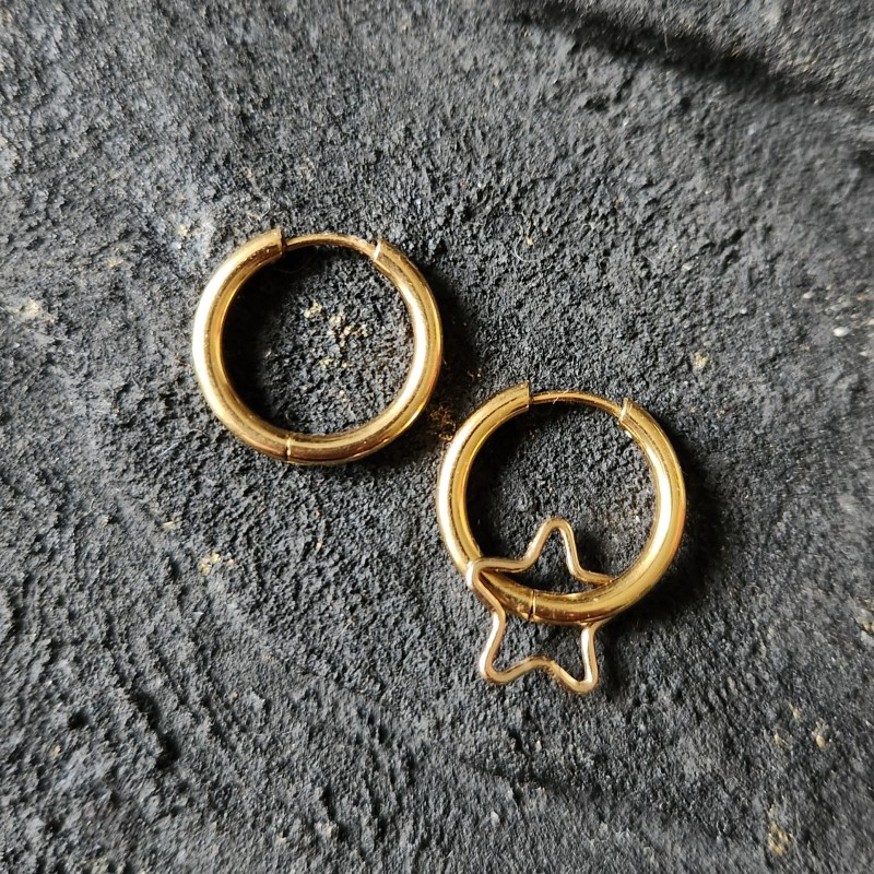 Légères; la créole mesure 1.4cm de diamètre. Une dormeuse nue et une dormeuse ornée d'une petite étoile lisse compose cette paire de boucles d'oreilles.
